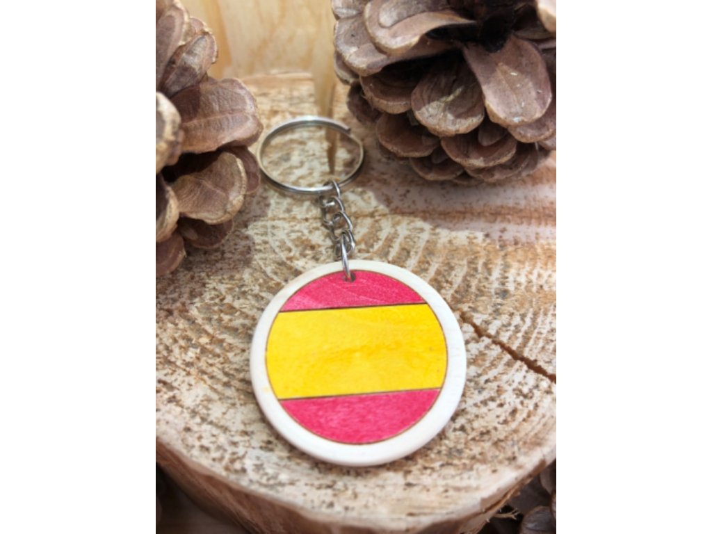 Dřevěný přívěsek na klíče s motivem vlajky Španělska.